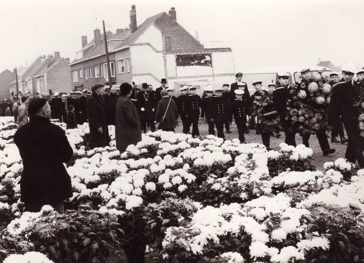 Formaat : 13 x 18 cm. - De leerlingen van de Ibisschool komen toe aan het Kerkhof Stuiverstraat voor de jaarlijkse hulde aan de op zeegebleven vissers,