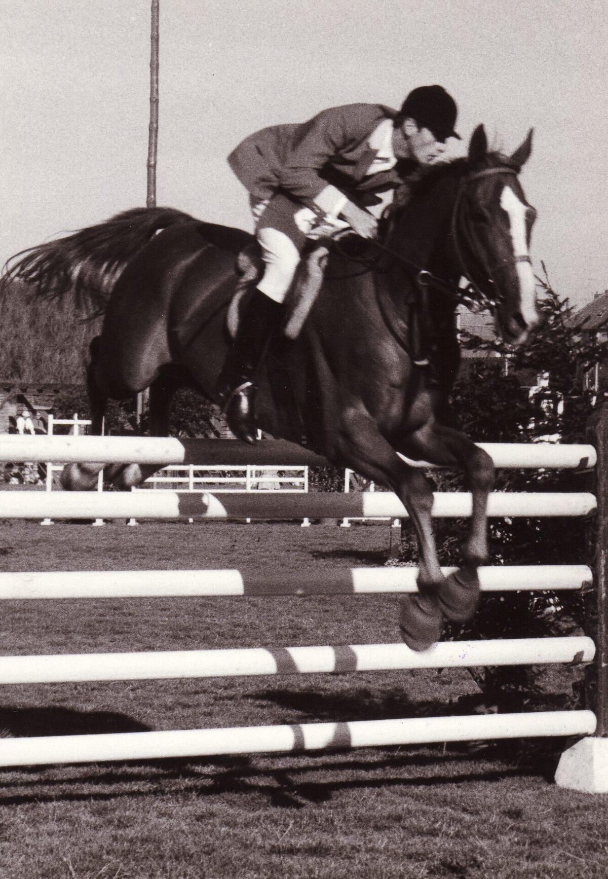 Formaat : 18 x 13 cm. - Ruiter Arthur Seynaeve gaat met zijn paard over een hindernis tijdens een springwedstrijd in het plantsoen van de Koninklijke Gaanderijen aan de Koningin Astridlaan.