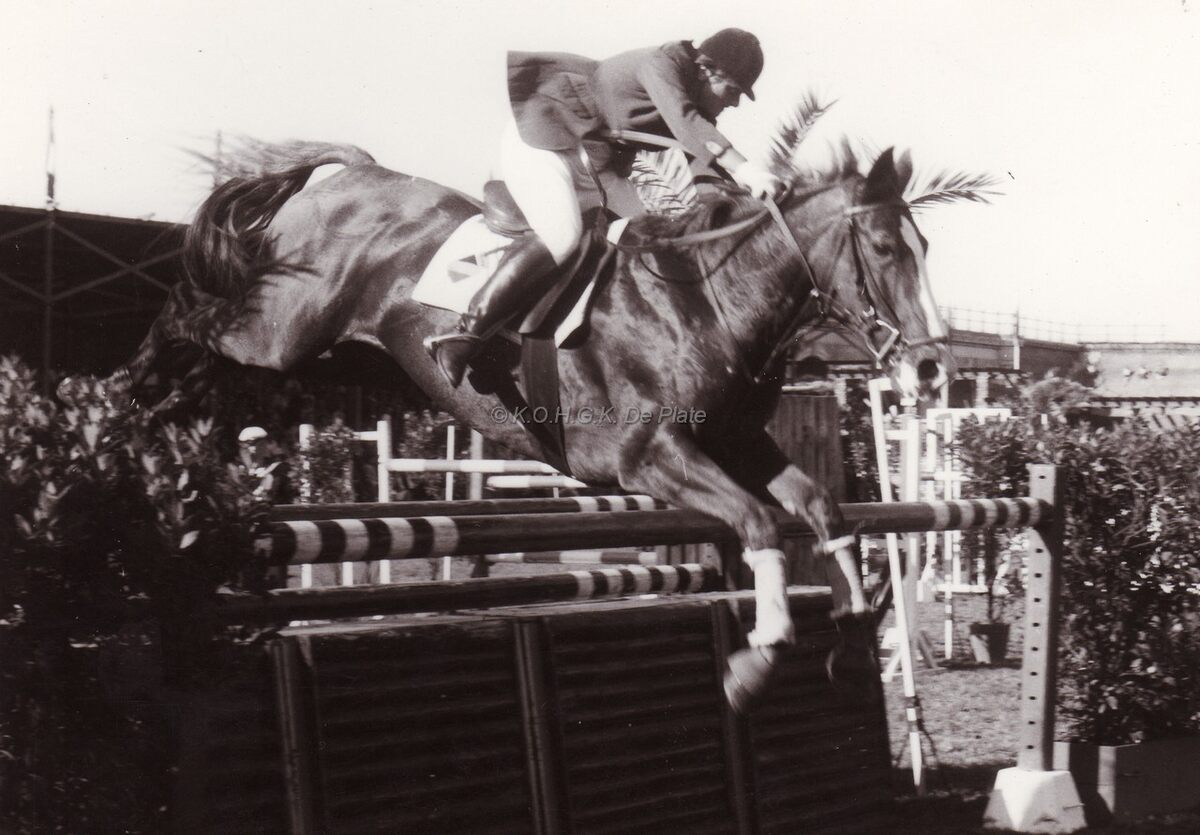 Ruiter THIRY en paard nemen een hindernis tijdens een springwedstrijd op het terrein aan de Koninklijke Gaanderijen.Rechts de Koninginnelaan en de "Drie Gapers".
