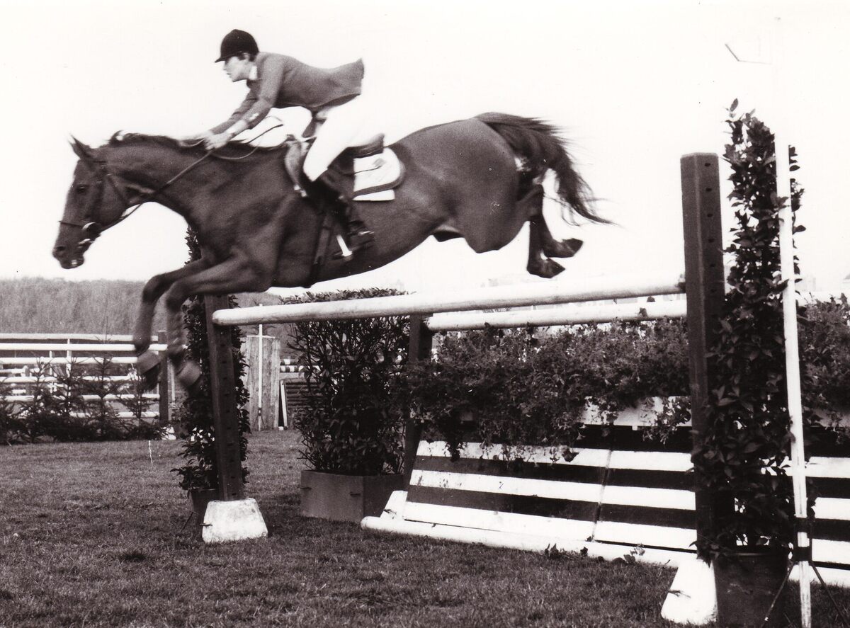 Formaat : 13 x 18 cm. - Ruiter Miss Kathy Kusner en paard Untouchable nemen deel aan de jumpingwedstrijd