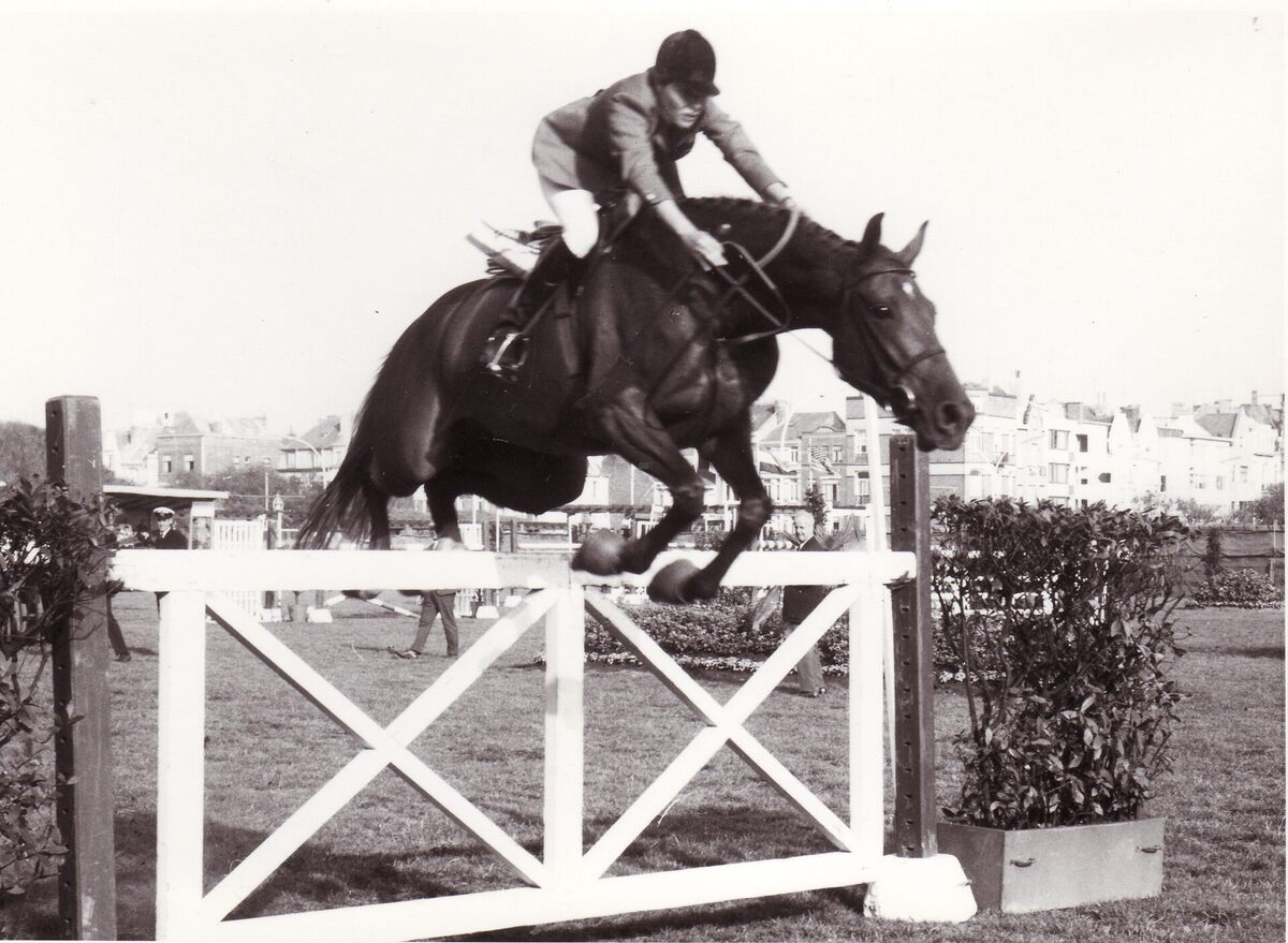 Formaat : 13 x 18 cm. - Ruiter Kathy Kusner met Fru nemen deel aan de jumpingwedstrijd