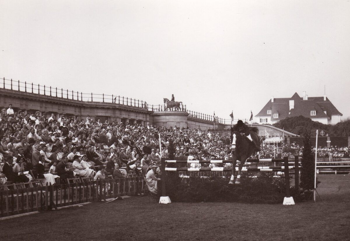 Formaat : 13 x 18 cm. - Ruiter en paard nemen deel aan de jumpingwedstrijd. Een massa volk op de tribune. In de achtergrond rechts de koninklijke villa, in het midden de drie gapers met ruiterstandbeeld