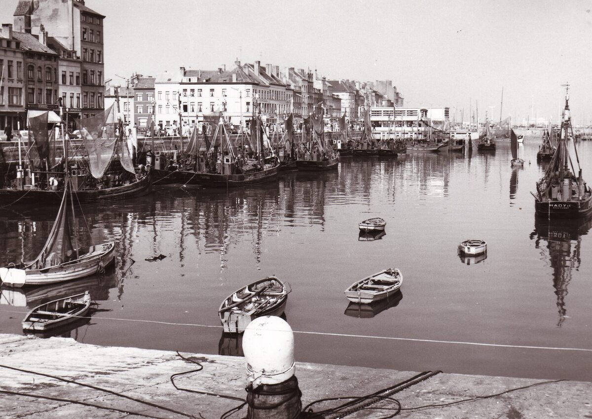 Formaat : 13 x 18 cm. - Algemeen zicht op het Montgomerydok en de Visserskaai met links het Vissersplein en rechts de Garnaalmijn. Op de voorgrond een metalen meerpaal, of bollaard