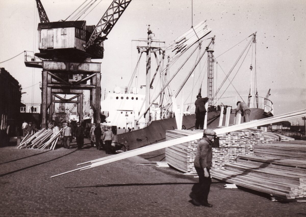 Formaat : 13 x 18 cm. - De lading hout van het Panamees vrachtschip Leo wordt ontladen aan het Vlotdok