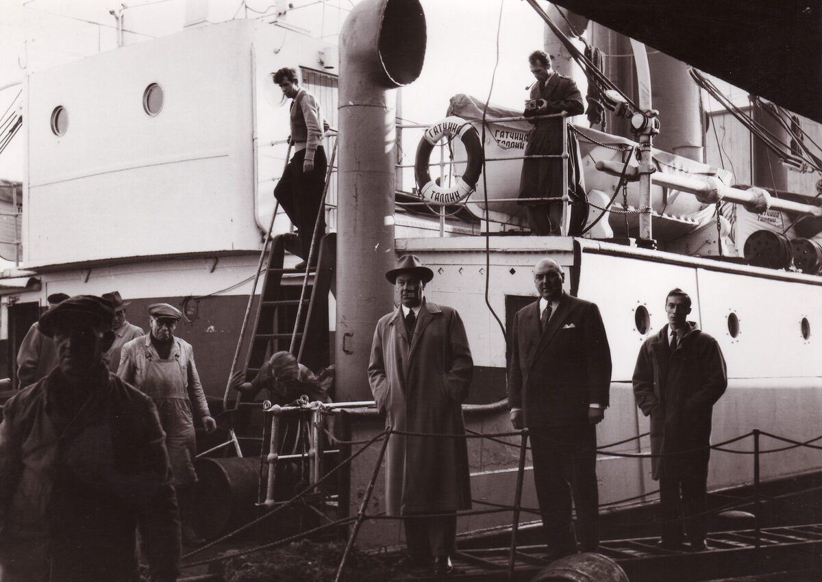 Formaat : 13 x 18 cm. - Het vrachtschip Gatchina V. Op de kade, centraal, schepen Maurice Quaghebeur, rechts Alfred Rigaux, later directeur van toerisme.