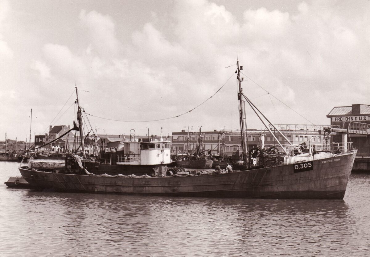 Formaat : 13 x 18 cm. - De Ijslandvaarder O.305 François Musin in het Visserijdok. Rechts de ijsfabriek Froid Industriel en links ernaast de petroleummaatschappij Purfina aan de Hendrik Baelskaai.