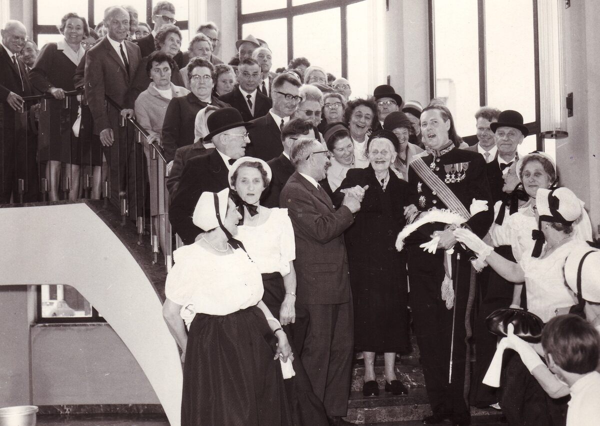 Formaat : 13 x 18 cm. - Een honderdjarige samen met haar familie op de trappen in het stadhuis, waar ze door burgemeester Jan Piers ontvangen werden.