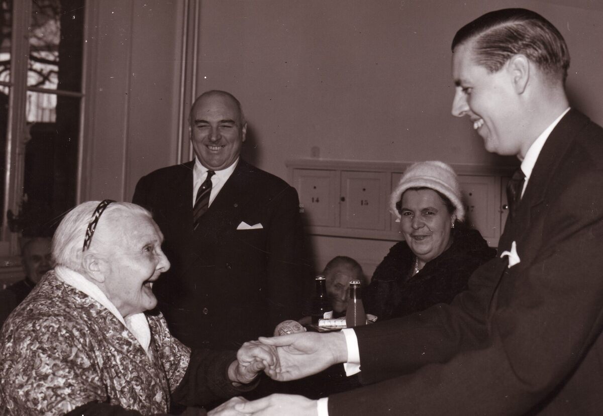 Formaat : 13 x 18 cm. - Burgemeester Jan PIERS feliciteert een blijehonderdjarige, schepen Maurice Quaghebeur (sr.) kijkt toe met een brede glimlach !