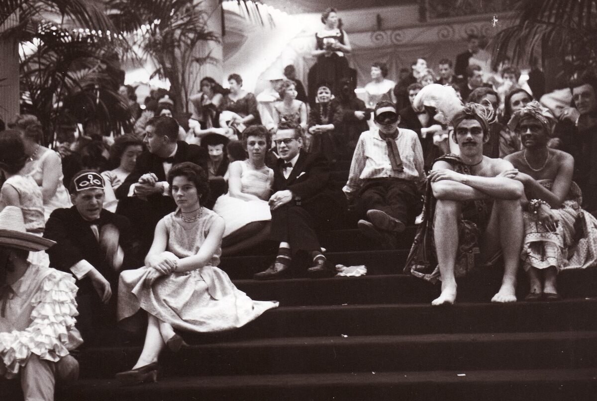 Formaat : 13 x 18 cm. - Feestvierders rusten uit op de trappen van het Kursaal tijdens het Bal du Rat Mort.