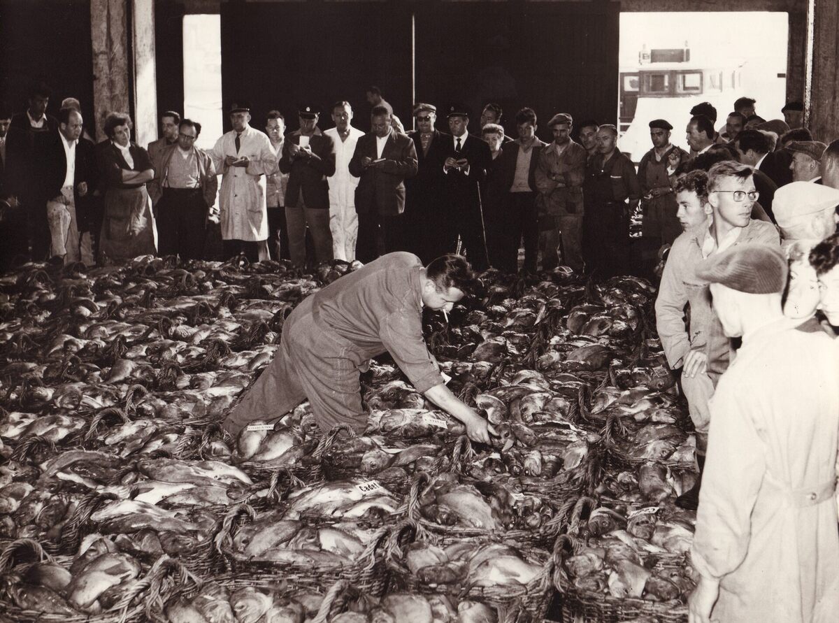 Formaat : 18 x 24 cm. - Visveiling in de Vismijn, alle prijzen worden genoteerd door de tegenschrijvers van de stad. "De afslag wordt verricht door de afslager, die vooraan staat en de te koop aangeboden vis luid afroept, in afdalende reeks. Soms loopt er nog een persoon in de vismijn tussen de vangsten, die met een stok aanwijst welke bennen vis er precies verkocht worden ; meestal wordt die taak echter gewoon door de afslager uitgevoerd. Wie van de potentiële kopers het eerst "mijn" roept, heeft de vis gekocht.