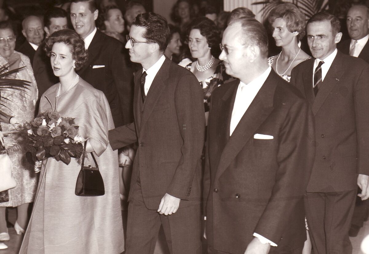 Koning Boudewijn en koningin Fabiola in het kursaal.Vooraan naast hen Roger DE RAMEE,concessionnaris,achter de koningin Jan PIERS burgemeester en achter de kursaalconcessionnaris provinciegoeverneur Pierre van OUTRYVE d'YDEWALLE,met naast hem mevrouw Jan PIERS.