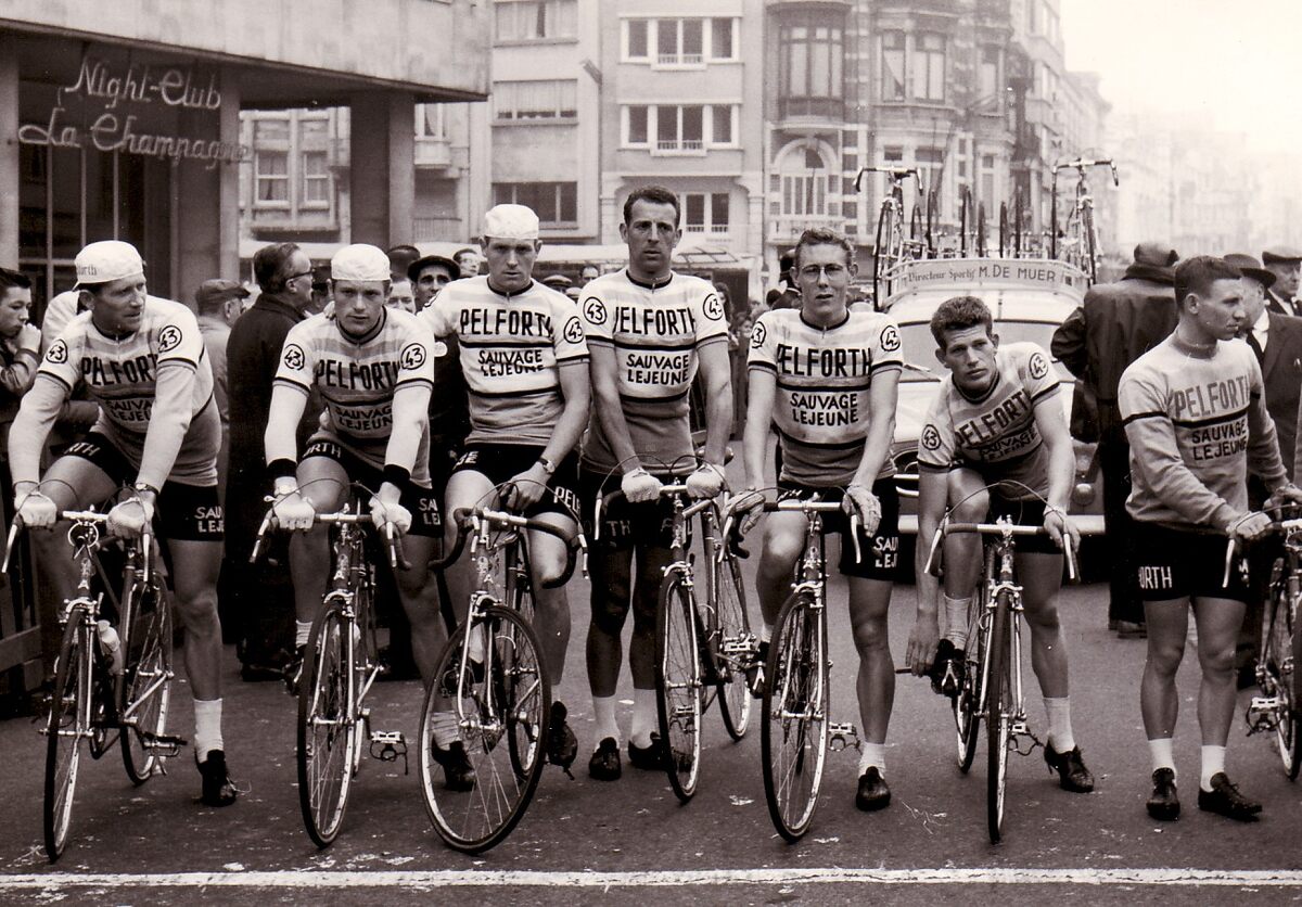 Wielerploeg (Pelforth) voor de start van een wedstrijd aan het kursaal.
