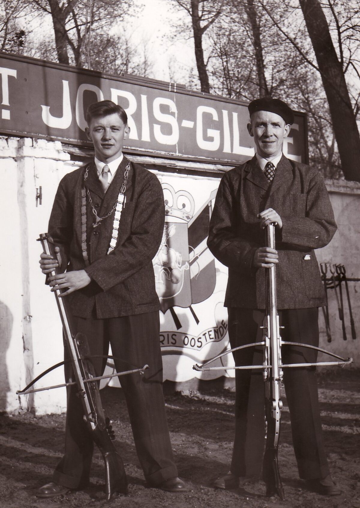 Twee leden van de balboogschutters Sint Jorisgilde. Links, Laurent Soenen en naast hem zijn vader (?). Hun lokaal was gevestigd in Café Armenonville in het Maria-Hendrikapark