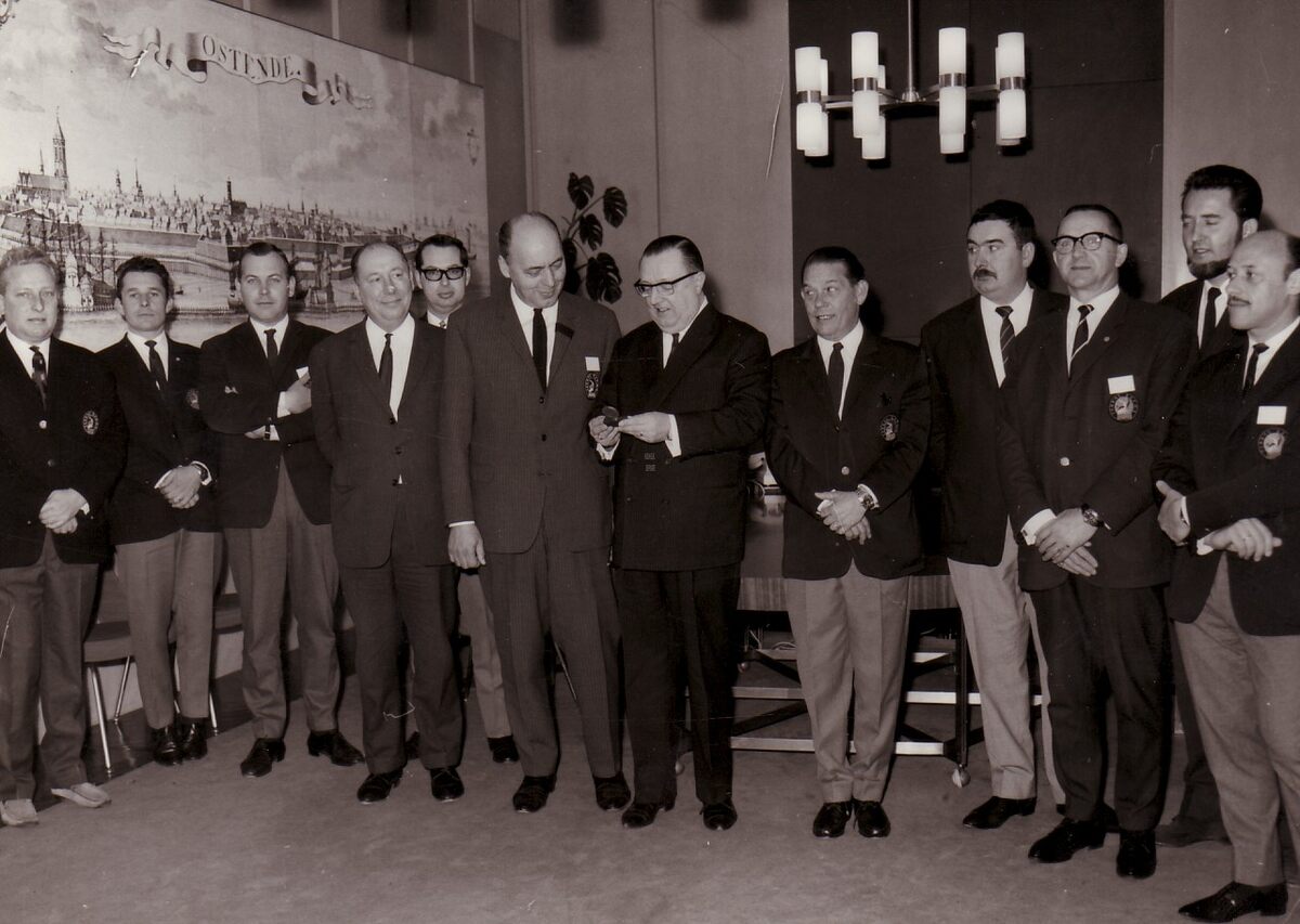 Een duikersvereniging wordt ontvangen op het stadhuis.Centraal John LAUWEREINS,waarnemend burgemeester,vierde van links John HERMANS,gemeenteraadslid en journalist.