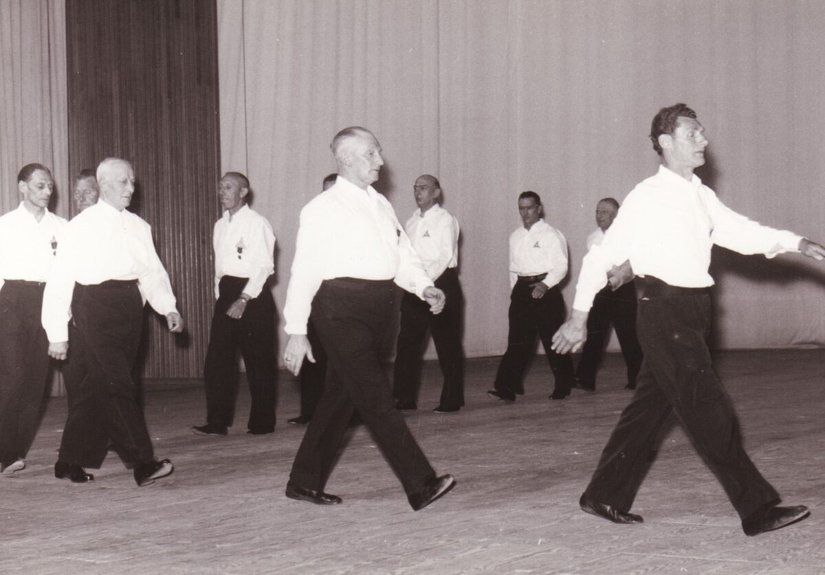 De senioren van turnvereniging OTV Noordzee bij een optreden in het kursaal. Achteraan op de scheidingslijn in kleur van de gordijnen, Maurice Vandecasteele