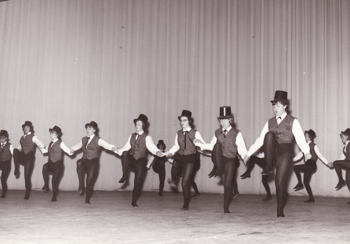 Een afdeling dames van een turnvereniging geeft een nummertje dans/turnen ten beste tijdens een optreden in het kursaal.