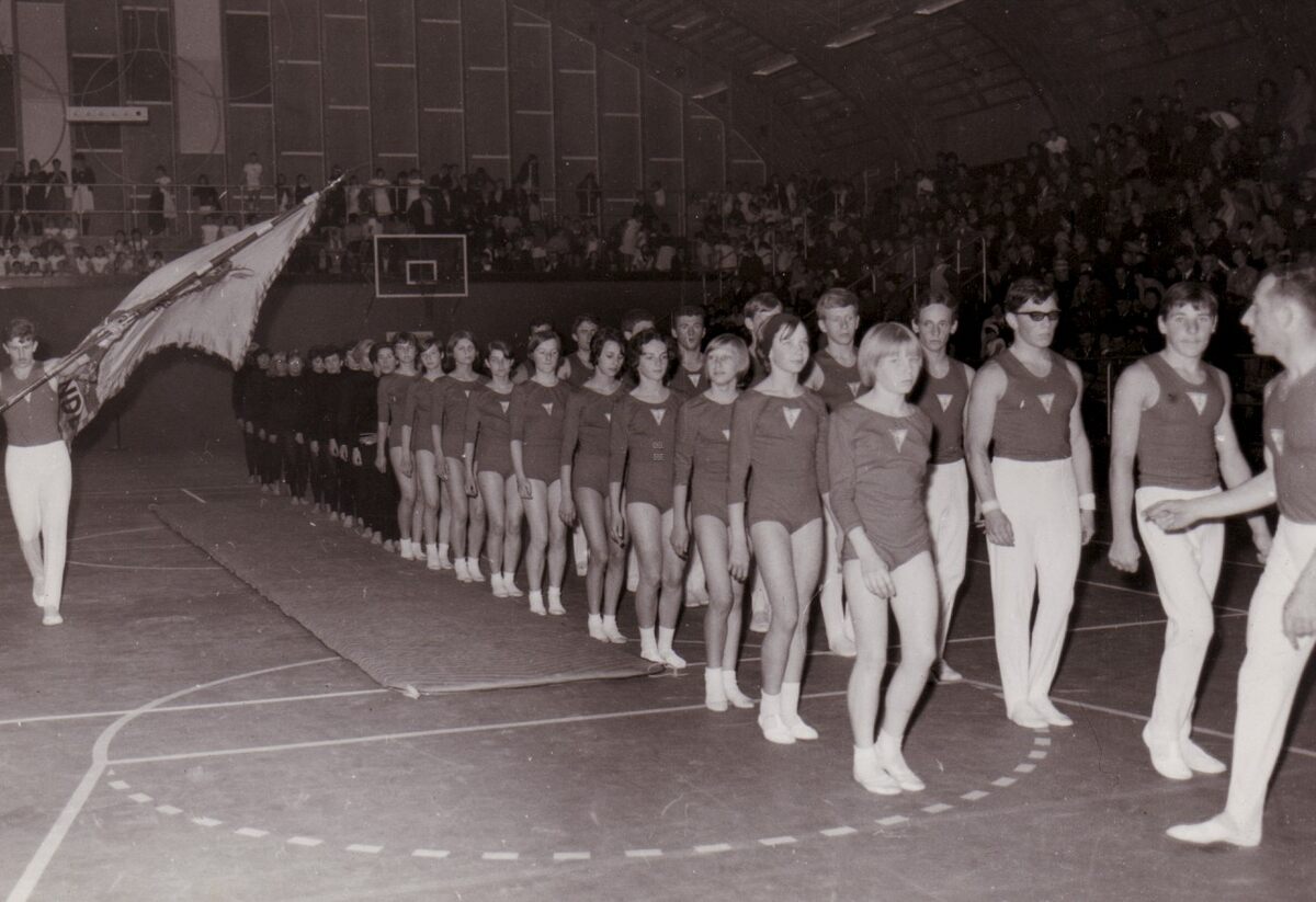 Intrede van de turners en turnsters van "Willen is Kunnen" in het sportcentrum aan de Koninginnelaan.