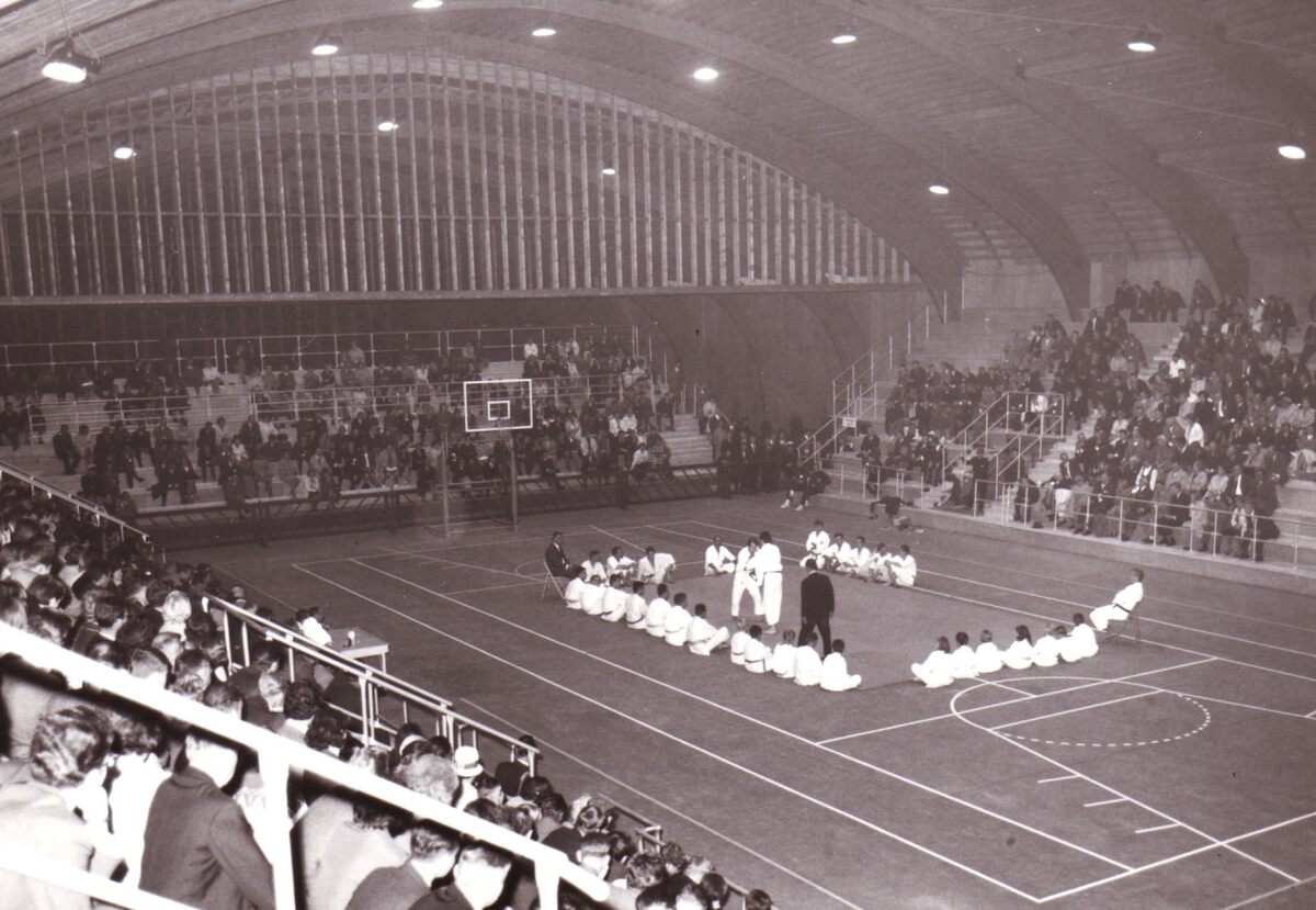 Optreden van een judovereniging in het sportcentrum aan de Koninginnelaan.