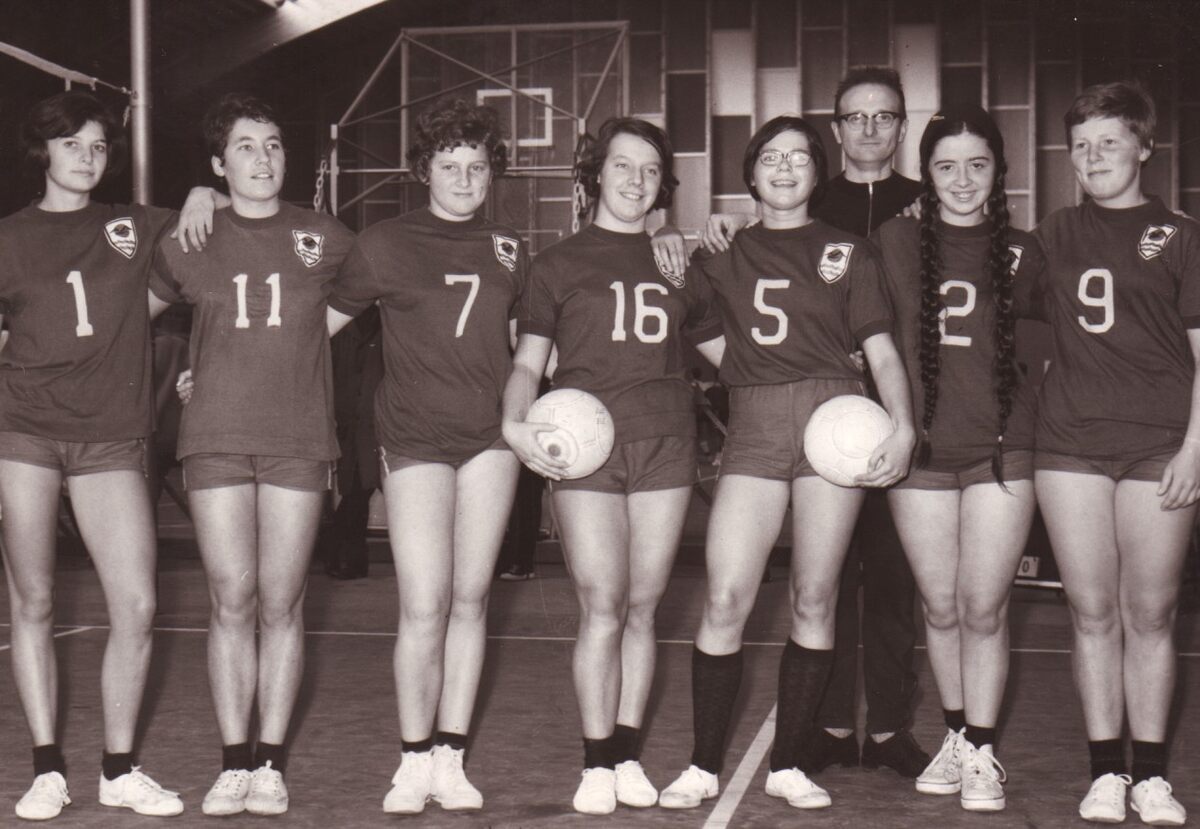 Vrouwelijke basketploeg in het sportcentrum aan de Koninginnelaan.