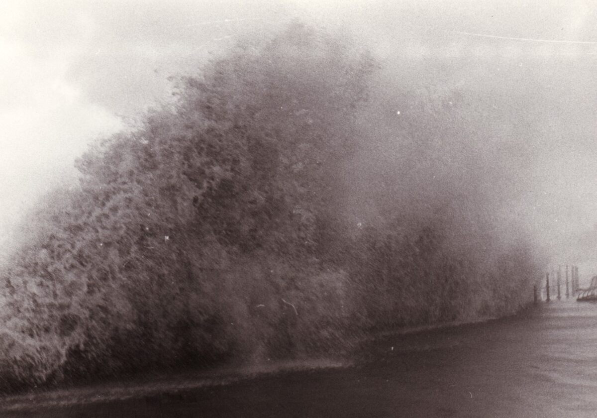 Een overslaande golf aan het Zeeheldenplein bij stormweer.