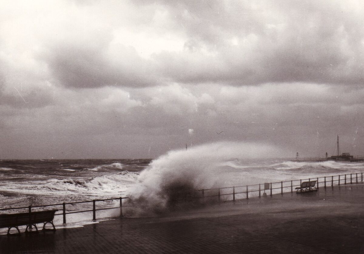 Overslaand water bij stormweer en hoog tij aan de Albert I Promenade.