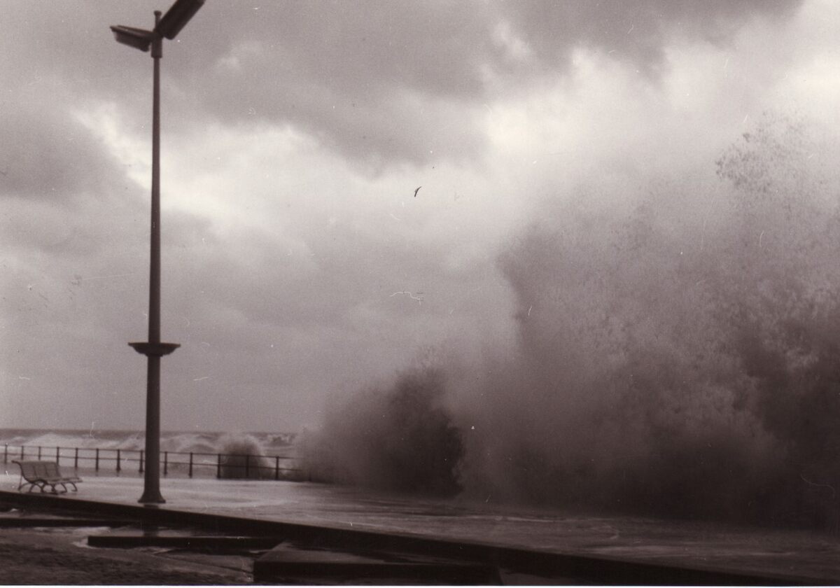 Overslaande golven aan de Albert I Promenade bij stormweer.Er is al een (laag) stormmurtje en riolering aanwezig.
