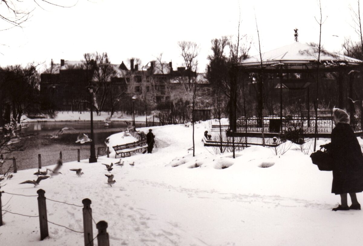 Formaat : 13 x 18 cm. - Het ondergesneeuwde Leopoldpark. Meeuwen op zoek naar voedsel. Op de achtergrond de Leon Spilliaertstraat.