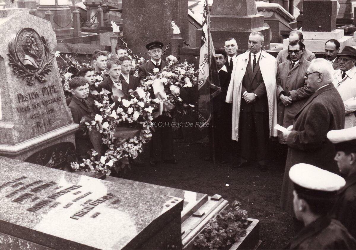 Jaarlijkse herdenking en bloemenhulde aan het graf van paster PYPE op het oud kerkhof aan Nieuwpoortsesteenweg, nu begraafplaats Paster Pype. We herkennen o.a. schepen Emiel VROOME. Hij was voorzitter van het "Herdenkingscomité Paster Pype", gesticht in 1962