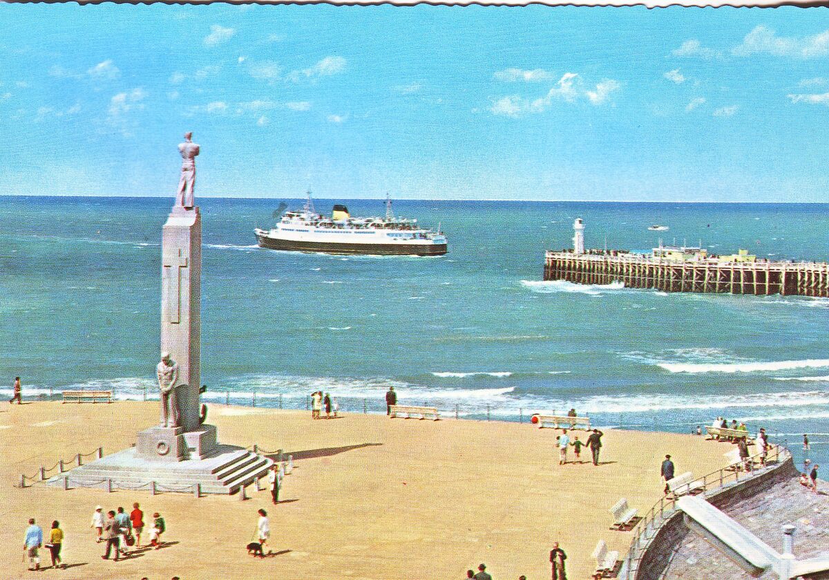 Cromo, N° 933/143. - Het "Nationaal Monument der Zeelieden" op het Zeeheldenplein. De carferry "Roi Baudouin" nadert de havengeul