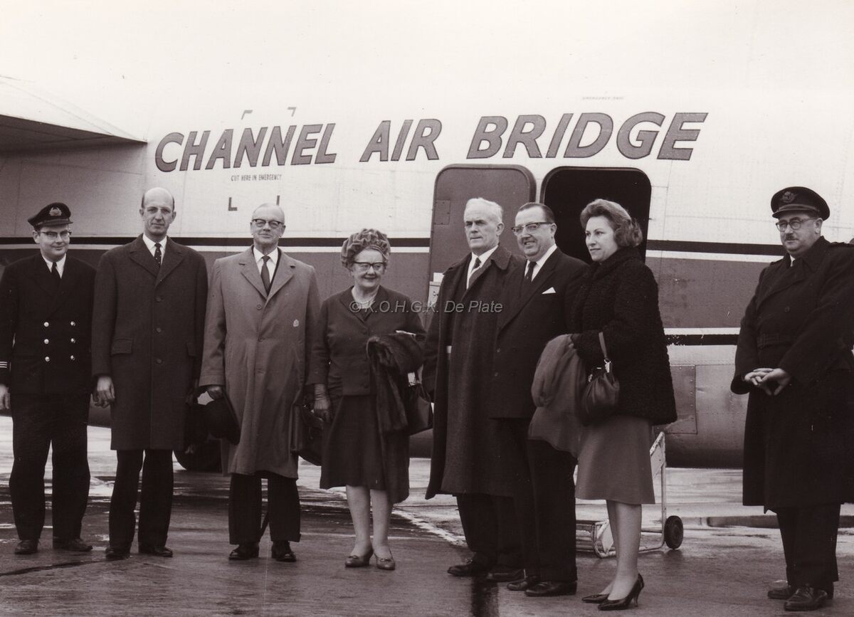 Waarnemend burgemeester John Lauwereins ontvangt op de luchthaven Raversijde een afvaardiging. "Channel Air Bridge, dochtermaatschappij van Air Charter Ltd. Opgericht te Londen in 1947 door F.A. Laker. Maakt sedert 1960 deel uit van de "British United Airways", gesteund door "Furnes Withy & Commonwealth Shipping". Channel Air Bridge werd opgericht in 1955 met als doel : luchtvervoer van passagiers, voertuigen en aanvullende vracht. Zij exploiteert de luchtlijnen naar Calais, Oostende en Rotterdam.