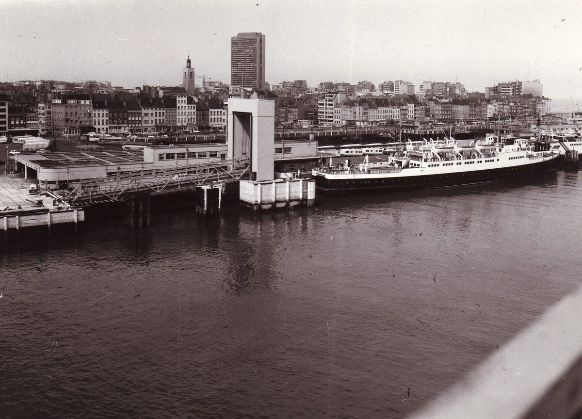 Formaat : 13 x 18 cm. - De carferry Prinses Josephine Charlotte aangemeerd bij de tweede laadbrug aan de Sir Winston Churchillkaai. Zicht op de stad