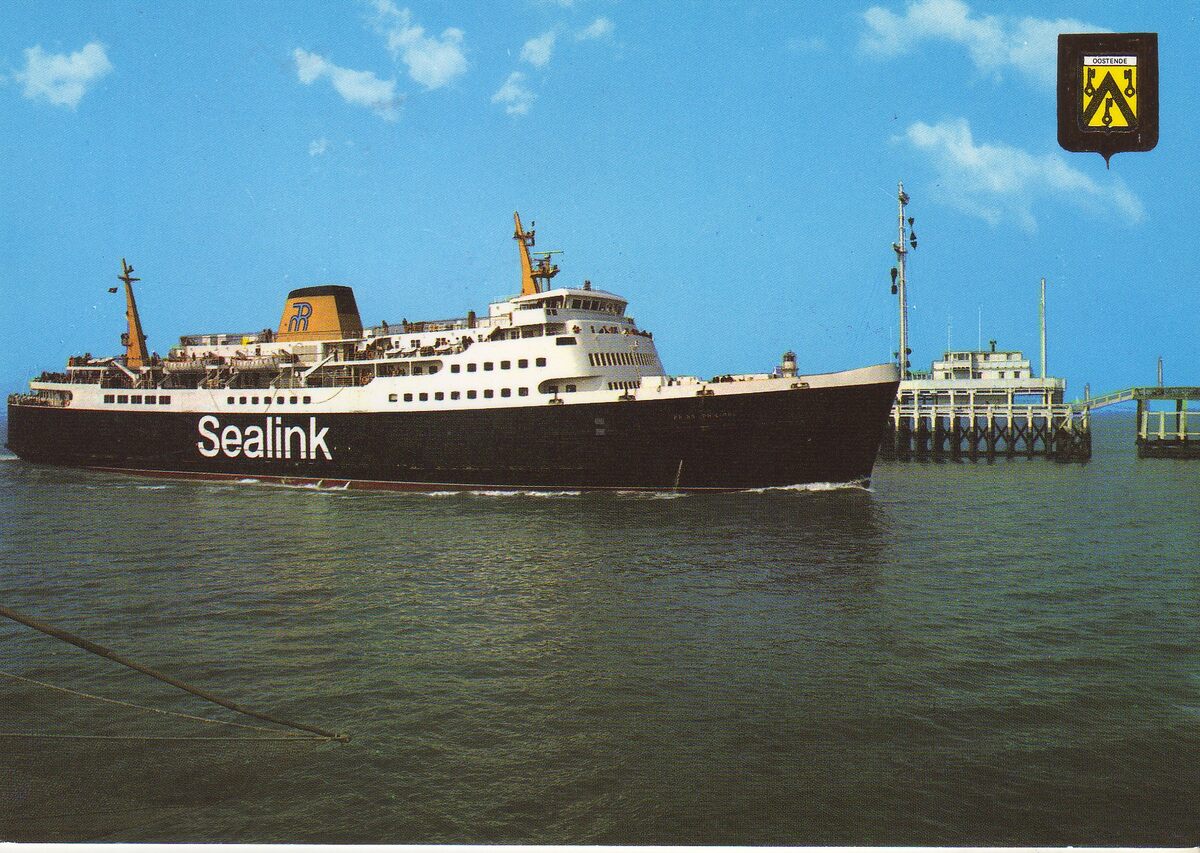 J.V.D.B., N° 102/22. - De carferry "Prince Laurent" van RMT-Sealink vaart de haven van Oostende binnen. Op de achtergrond, de tijseinpoost op het Ooststaketsel