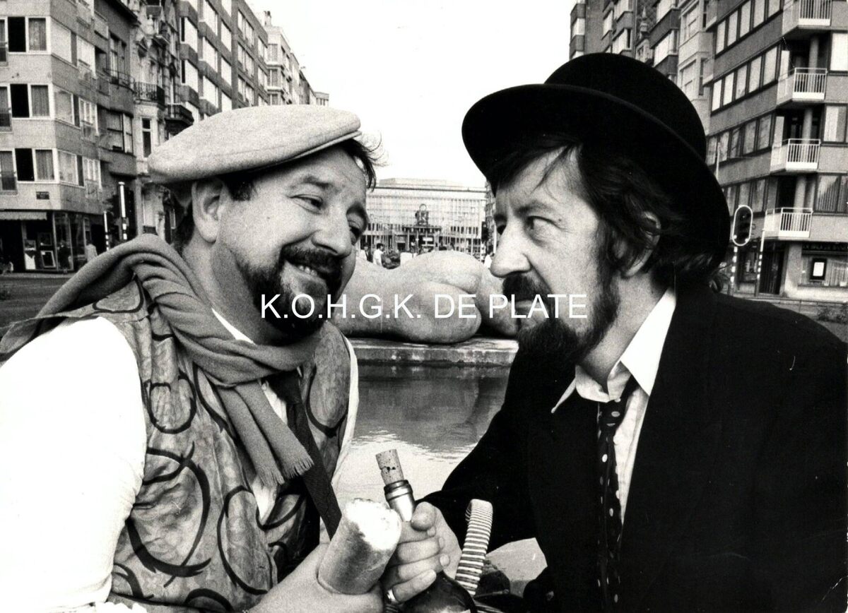 Formaat : 13 x 18 cm. - "Pette Sjieke" (Gerard Dangreau) en "Tjeppen Krotte" (Herman Moerman), de twee hoofdrolspelers in talrijke Oostendse revues, hier in de Leopold II-laan, nabij "Dikke Mathille". Foto werd waarschijnlijk genomen voor de revue "Mo kiekt e kè doa"" (1975 )