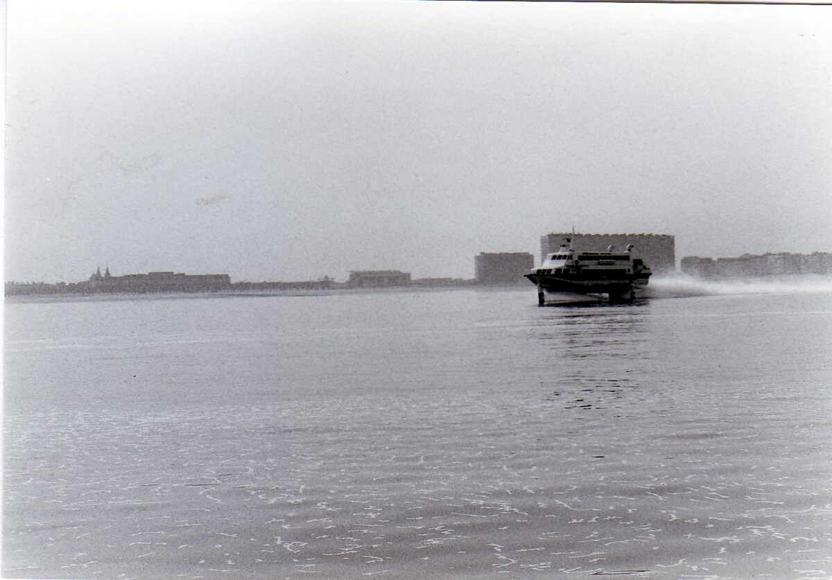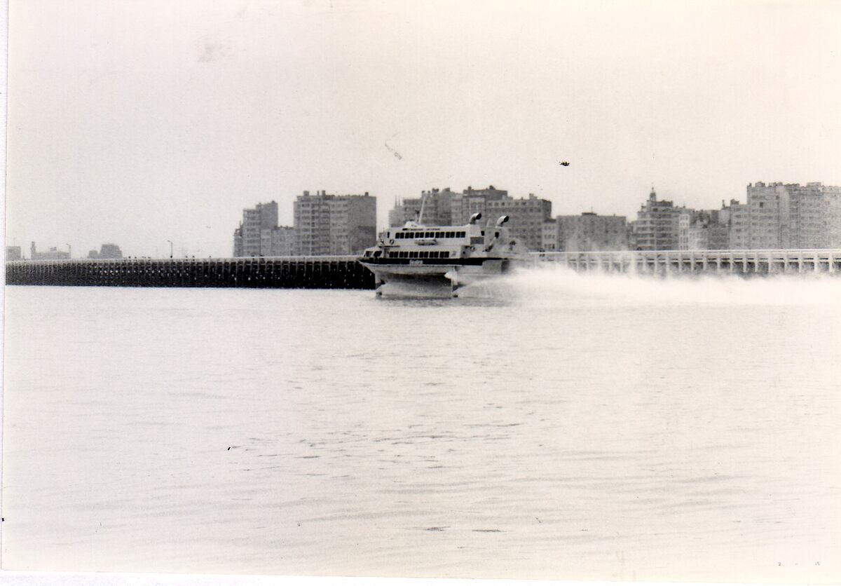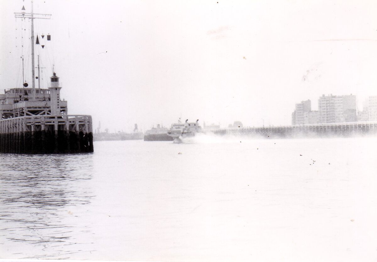 3 foto's van invarende jetfoil "Princesse Clementine" in de haven van Oostende. 2e foto : links, detail van de tijseinpost op het Ooststaketsel