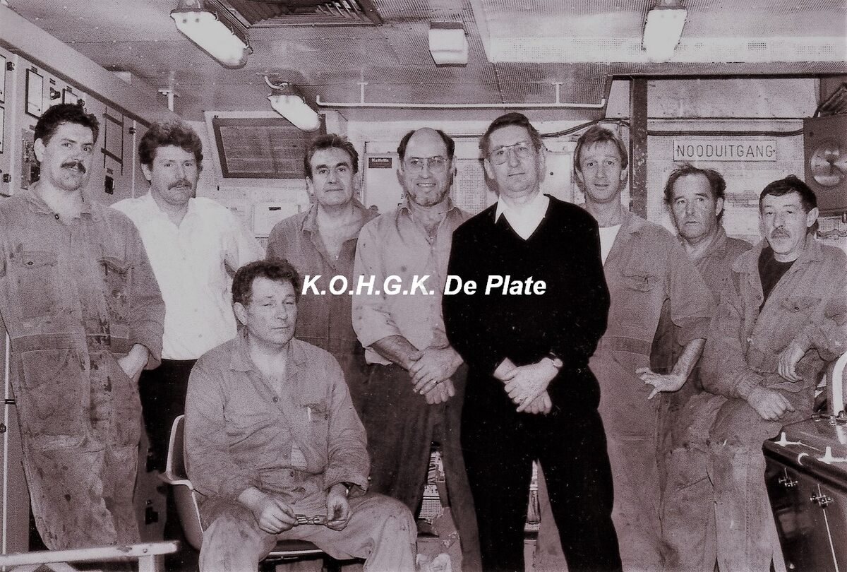 Foto (kopie), formaat : 18 x 13 cm. - Machinepersoneel car-ferry "Reine Astrid" ex "Stena Nautica" Van links naar rechts : werktuigkundige Etienne Velghe, 2° officier werktuigkundige Sorel Fernand, werktuigkundige René Luyens, Stoker Roger Blonde, 1° officier werktuigkundige Cogghe Roland, elektrieker Ronny Martinsen, werktuigkundige Marcel Van Torre, werktuigkundige Jaques Marcel. Zittend : 3° officier werktuigkundige Gilbert Demeester.