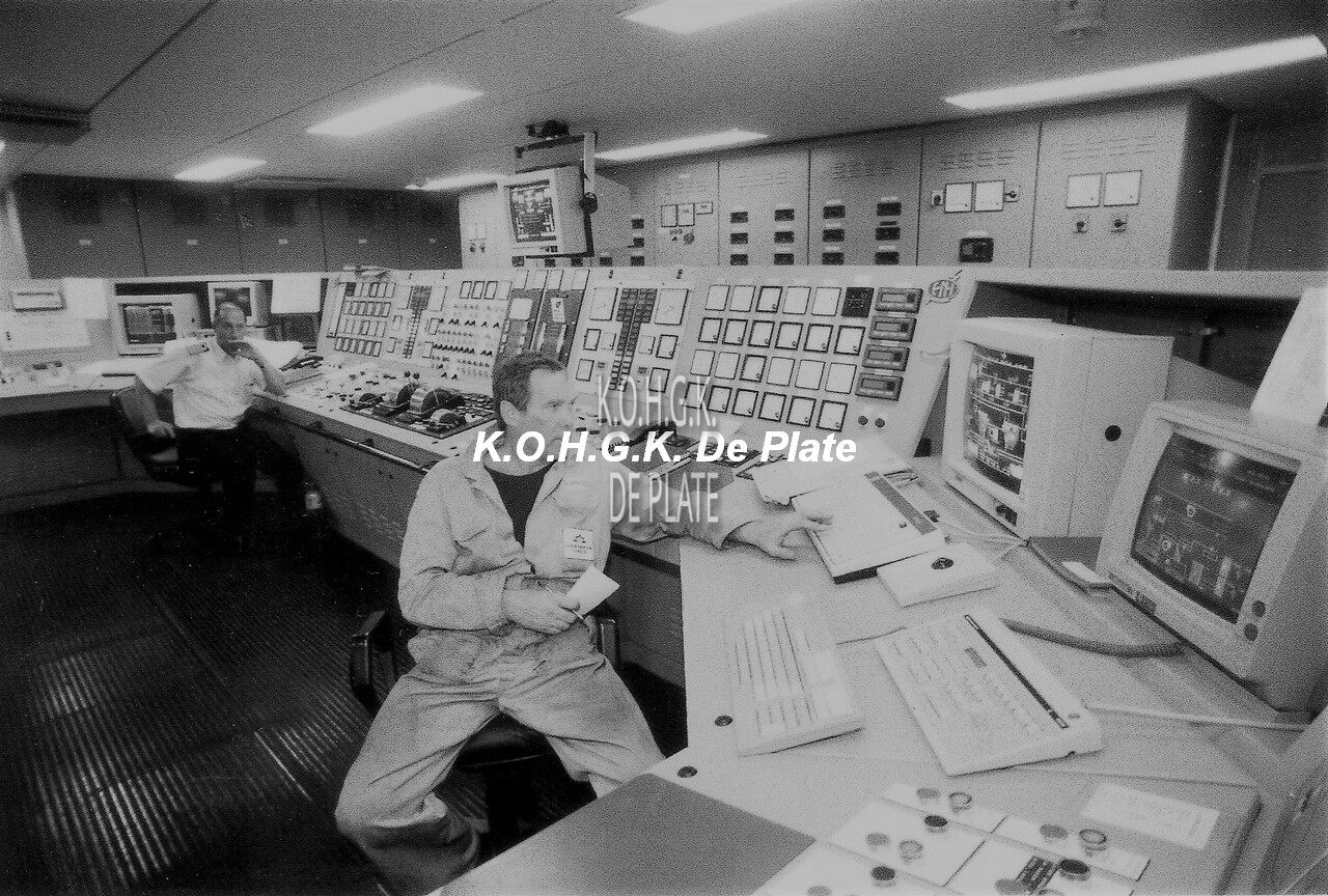 Afdruk, formaat : 18 x 13 cm. Controlekamer carferry "Prins Filip". Achteraan, 1° Officier werktuigkundige Robert Martinsen en vooraan, werktuigkundige Klutsch Willy.