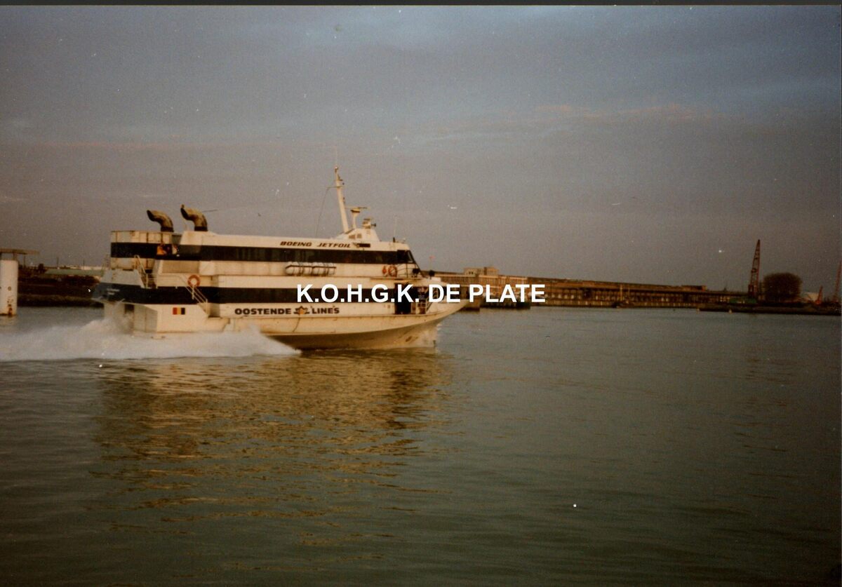 Formaat : 10 x 15 cm. Jetfoil "Prinses Stephanie" in de havengeul. In de achtergrond de vismijn