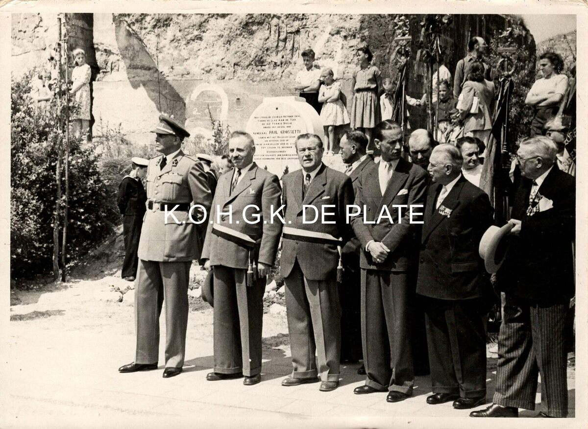 Formaat : 13 x 18 cm. - Antoine Demoulière (tweede van rechts) bij een plechtigheid aan het Monument Generaal Paul Grossetti te Westende (Middelkerke)