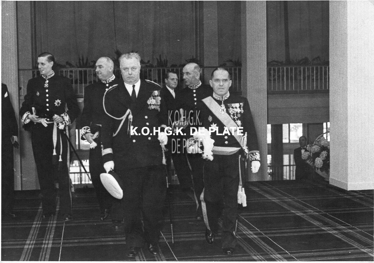 Formaat : 13 x 18 cm. - Burgemeester Adolf Van Glabbeke in gezelschap van de afgevaardigde van koning Boudewijn, Lambert Robins. Achter, van links naar rechts : de schepenen Jan Piers, Maurice Quaghebeur sr. en Kamiel Dehouck.