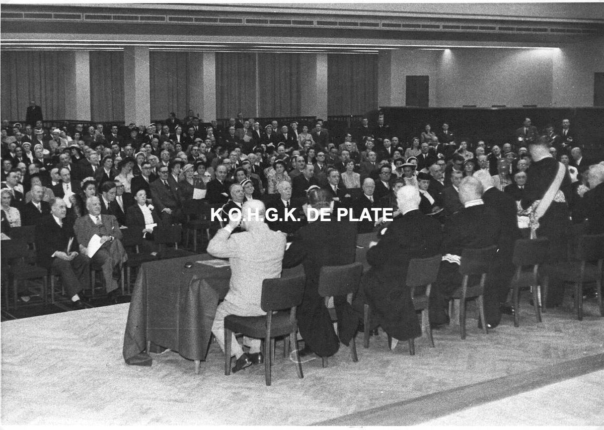 Formaat : 13 x 18 cm. - Academische zitting in de concertzaal. Burgemeester Adolf Van Glabbeke houdt zijn toespraak.