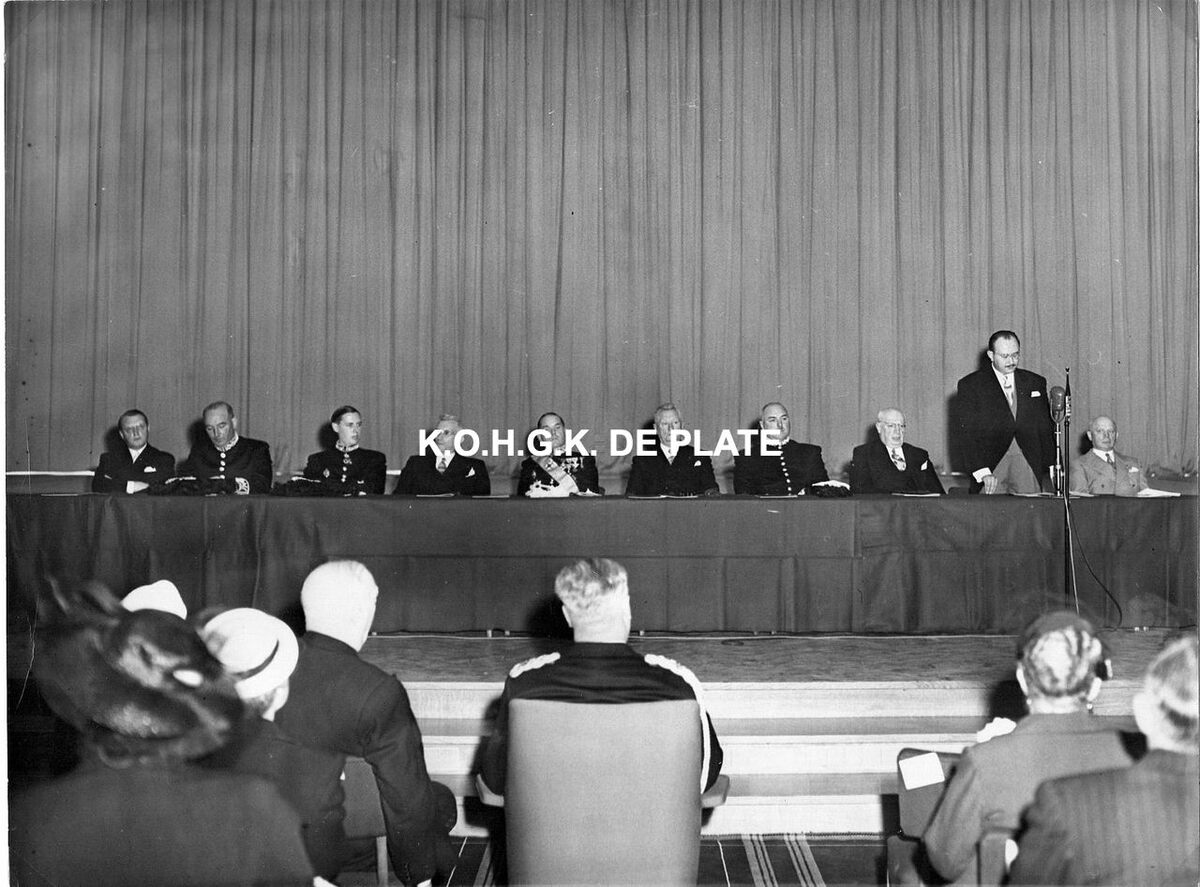 Formaat : 18 x 24 cm. - Academische zitting in de concertzaal. - Roger De Ramée, directeur van het Kursaal, houdt zijn toespraak. We herkennen van links naar rechts : architect Léon Stynen, de schepenen Kamiel Dehouck en Jan Piers, minister Ludovic Moyersoen, burgemeester Adolf Van Glabbeke, de schepenen Emiel Vroome en Maurice Quaghebeur sr., stadssecretaris Michel Surmont en Martin Boddewijn, van de bouwfirma Dumon & Vander Vin.