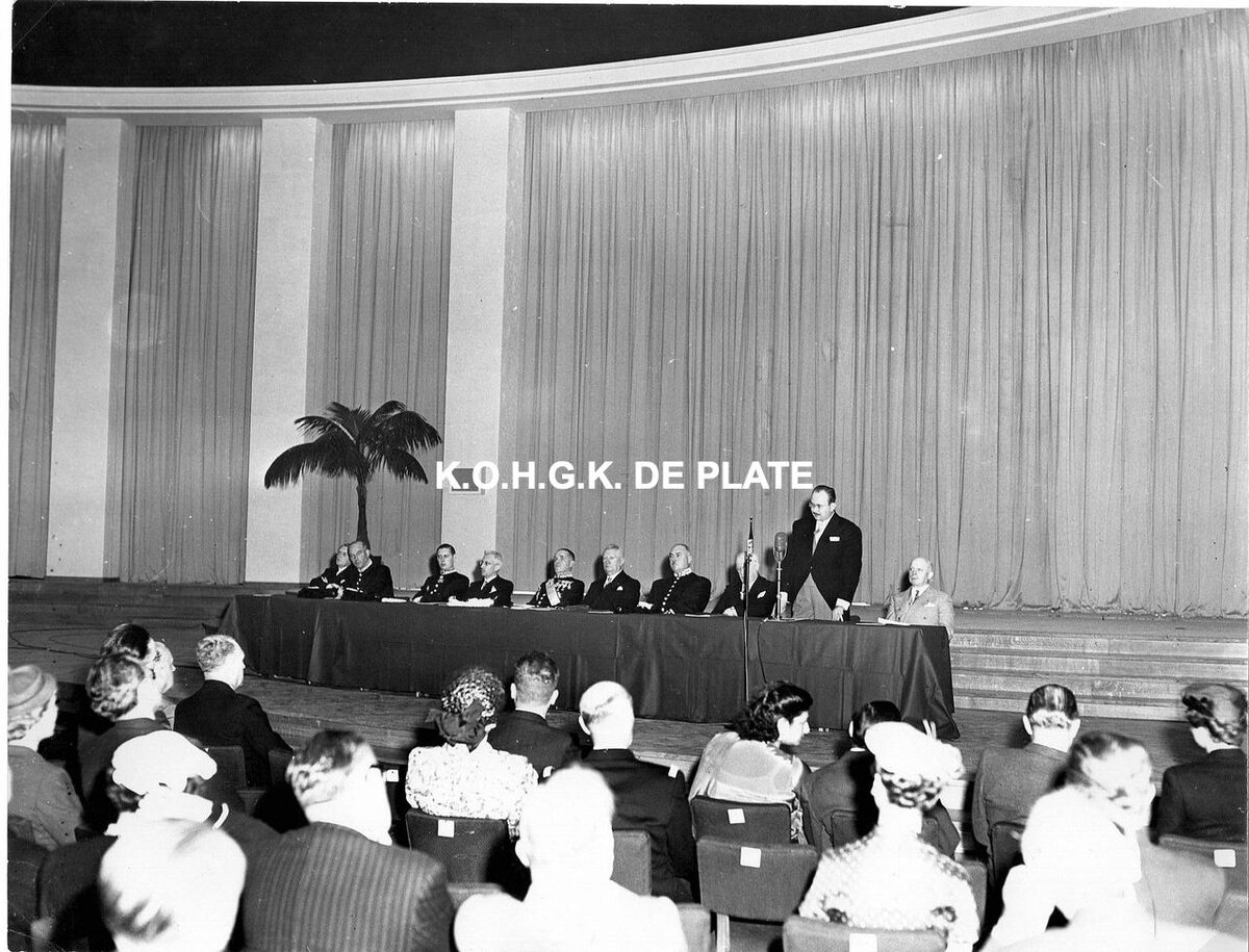 Formaat : 18 x 24 cm. - Academische zitting in de concertzaal. Roger De Ramée, directeur van het Kursaal houdt zijn toespraak. We herkennen van links naar rechts : architect Léon Stynen, de schepenen Kamiel Dehouck en Jan Piers, minister Ludovic Moyersoen, burgemeester Adolf Van Glabbeke, de schepenen Emiel Vroome en Maurice Quaghebeur, stadssecretaris Michel Surmont en Martin Boddewijn, van de bouwfirma Dumon & Vander Vin.