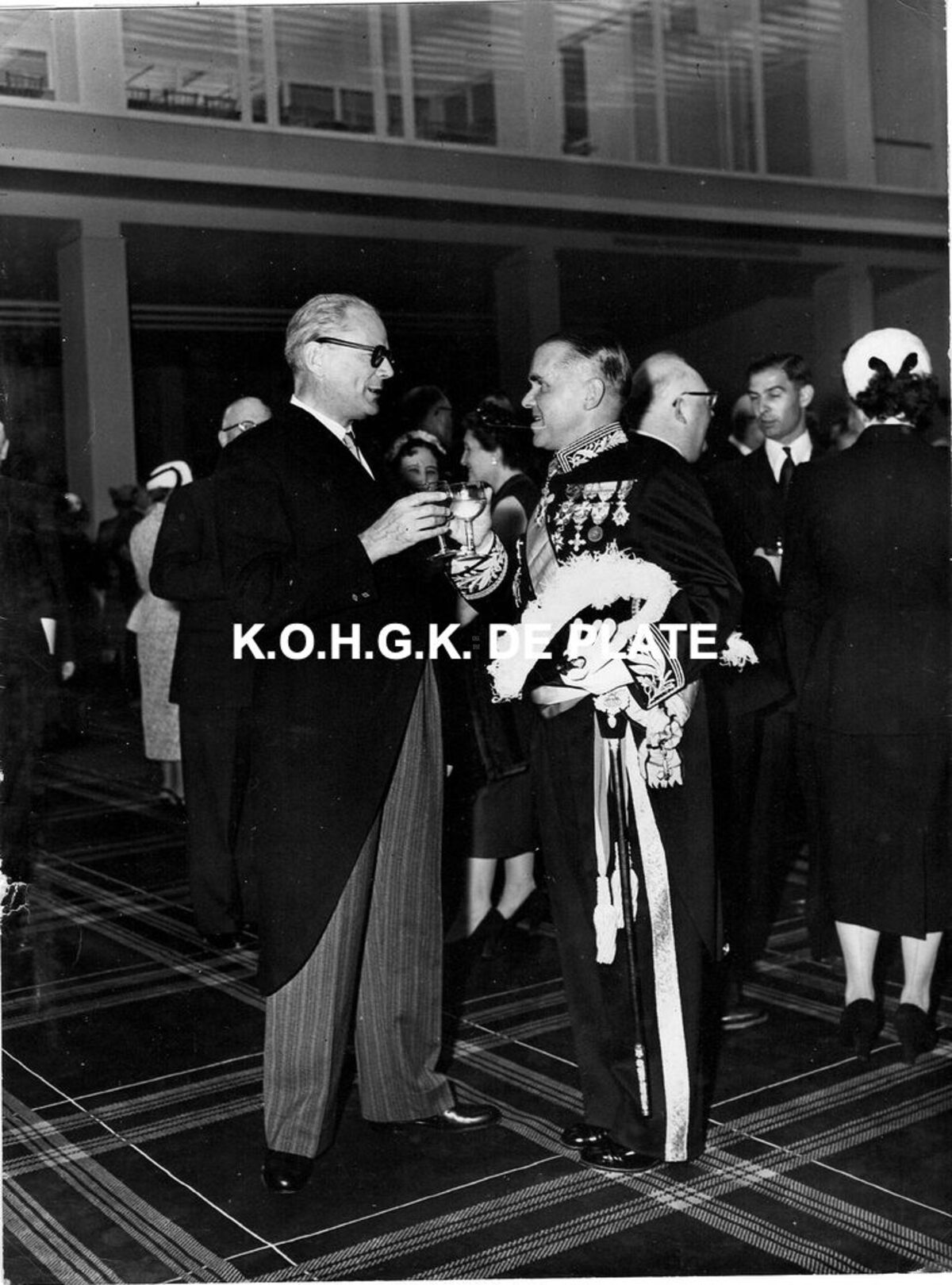 Formaat : 24 x 18 cm. - Receptie in de erehal. Burgemeester Adolf Van Glabbeke in gesprek.
