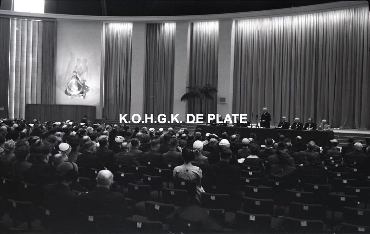 Negatief : 6 x 9 cm. - De academische zitting in de concertzaal. Schepen Emiel Vroome duoudt zijn toespraak.