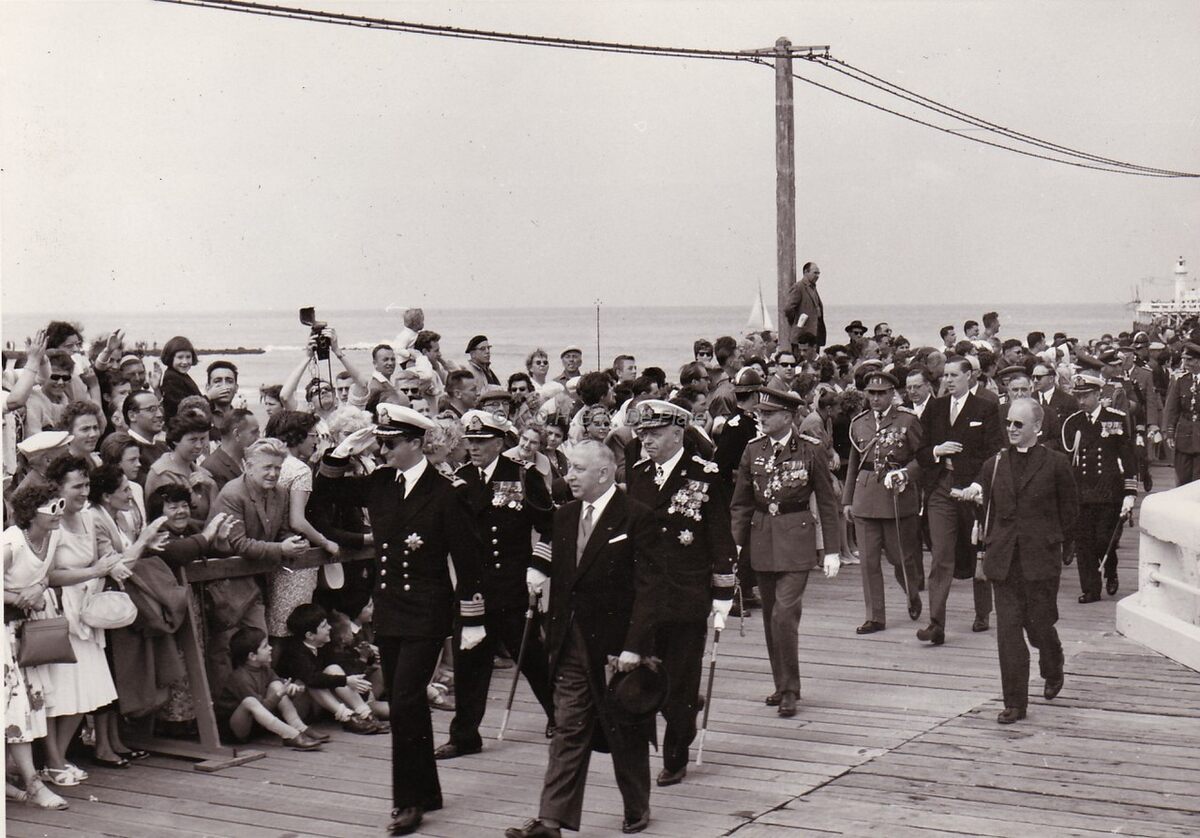 Prins Albert op het westerstaketsel ter gelegenheid van de jaarlijkse vlootparade,naast hem P.W. SEGERS,minister van defensie,achter hem twee officieren van de Zeemacht, links Kapitein ter Zee Jules DELFORGE, rechts Commodore ROBYNS. Ook burgemeester Jan PIERS is er bij. De Zeemacht-officier achteraan is Fregatkapitein Jules Van Dyck, de latere Admiraal.