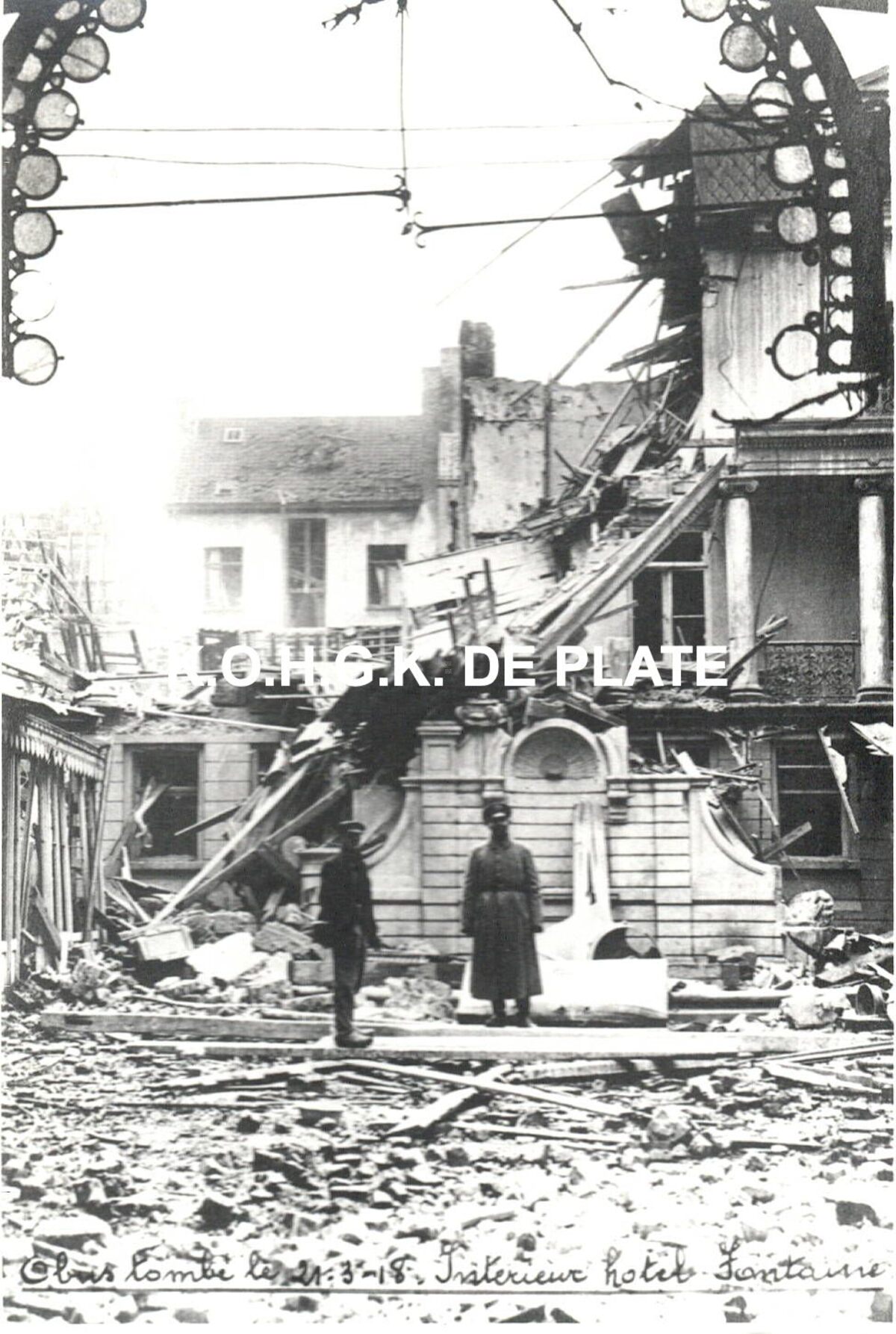 Formaat : 12,5 x 8,5 cm. - Obus tombé le 21-3-18. Interieur hotel Fontaine. - Uitleg : zie inventarisnummer 2017/0714.