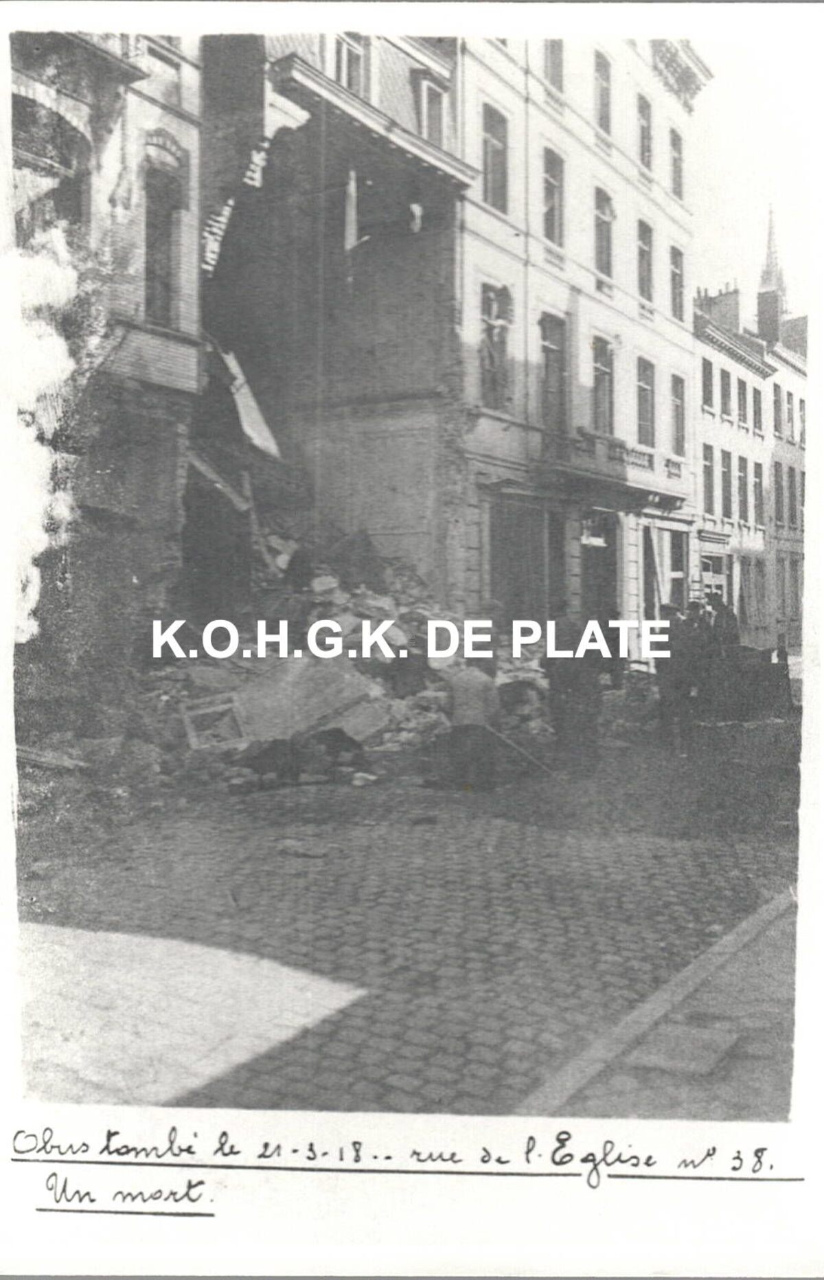 Formaat : 12,5 x 8,5 cm. - Obus tombé le 21-3-18 rue de l'Eglise n°38. Un mort. - Bij de beschieting viel er één dodelijk slachtoffer : Clement Léontine Marie, echtgenote van Vercoullie Bernard.