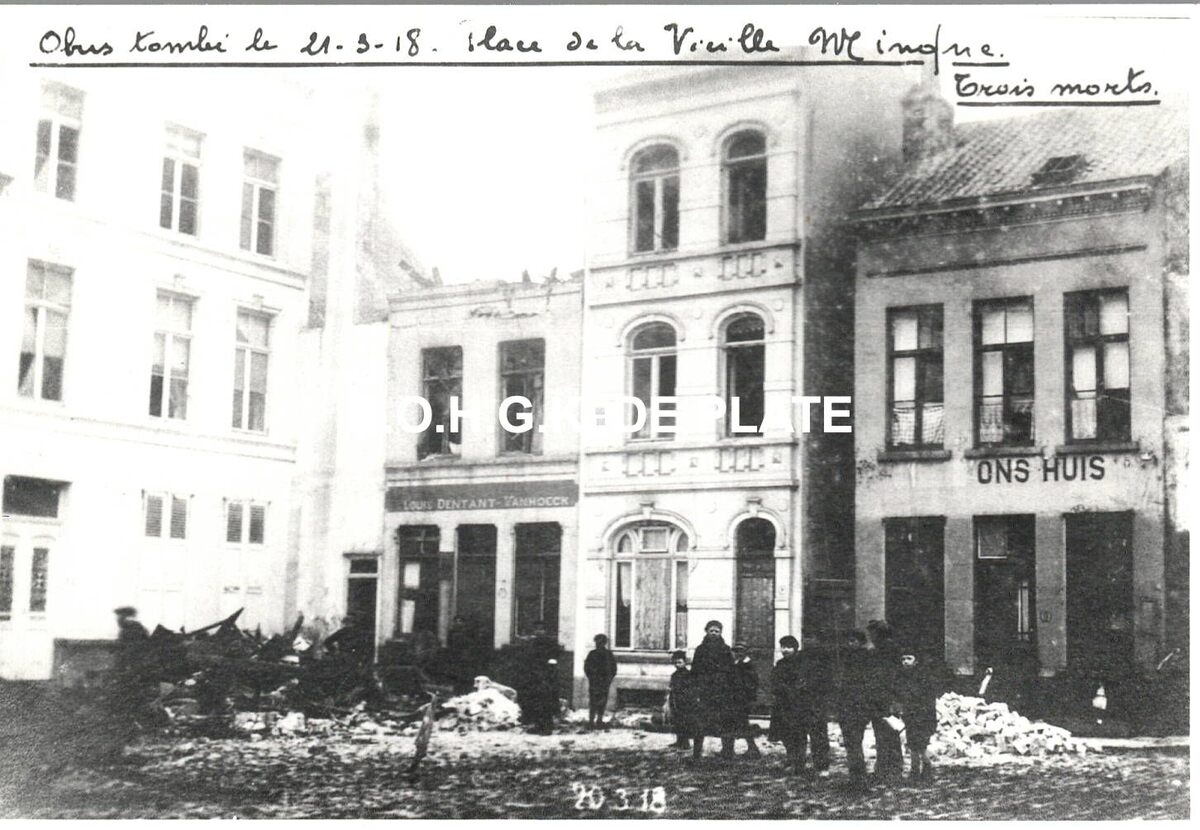 Formaat : 8,5 x 12,5 cm. - Obus tombé le 21-3-18. Place de la Vieille Minque. Trois morts. - Bij de beschieting van 21 maart van het Mijnplein, of de Oude Mijnplaats vielen er drie dodelijke slachtoffers : Ghewy Marie-Louise, Ghewy Maximilien Arthur en Deboutte Pierre Jacques. Links, "Café au Shah de Perse", Louis Dentant-Vanhoeck. Rechts "Café Ons Huis". - Merkwaardig aan deze foto is dat de Franstalige opschriften : "Café au Shah de Perse chez" en "Café" van Ons Huis zijn overschilderd.