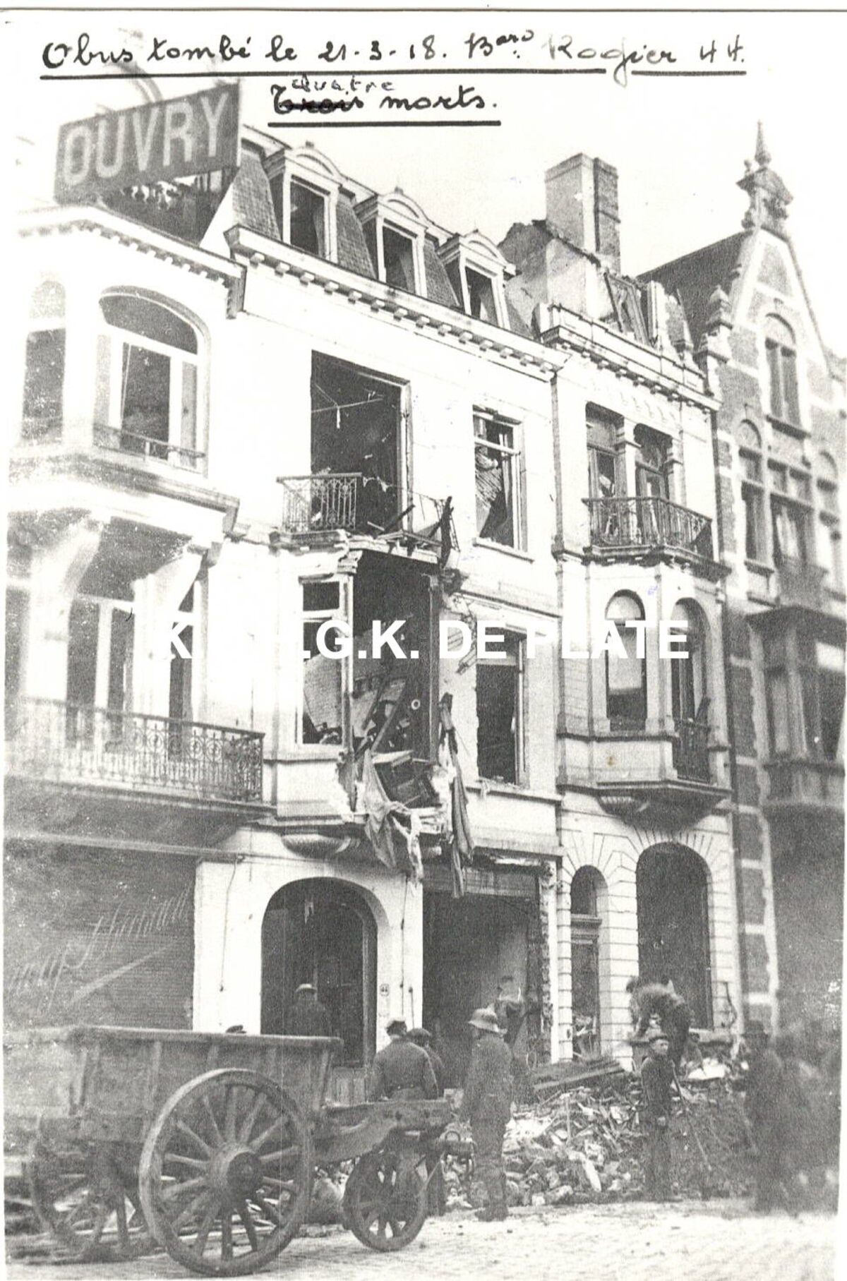 Formaat : 12,5 x 8,5 cm. - Obus tombé le 21-3-18. Boulevard Rogier 44. Quatre morts. - Tijdens de beschietingen van 21 maart werden de woningen nrs. 42 en 44 zwaar beschadigd. In de woning nr. 44, links, vielen er vier oorlogsslachtoffers : de Moyard Emma, Beuselinck Emilie, Ouvry Marie en De Hollander Henri. Hier was de handelszaak gevestigd van Jules Ouvry-Schockaert.