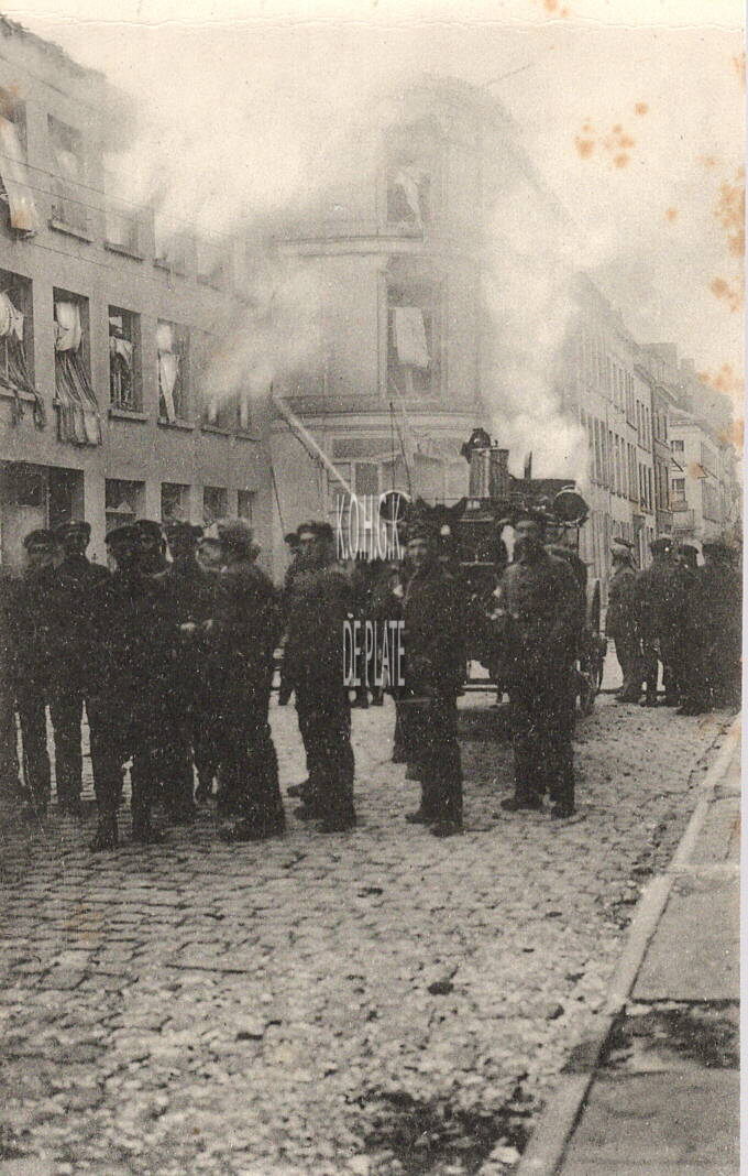 Nels. Edition René Baervoets, 7, rue Longue, Ostende. - Ostende - Rue des Capucins. L'effet d'un obus, le 20 mars 1918. - Tijdens de beschietingen van 21/03/1918 werden de woningen nrs. 12, 14 en 16 zwaar beschadigd. Hier het brandblussen van woning nr.12 rechtover de Kapucijnenkerk.
